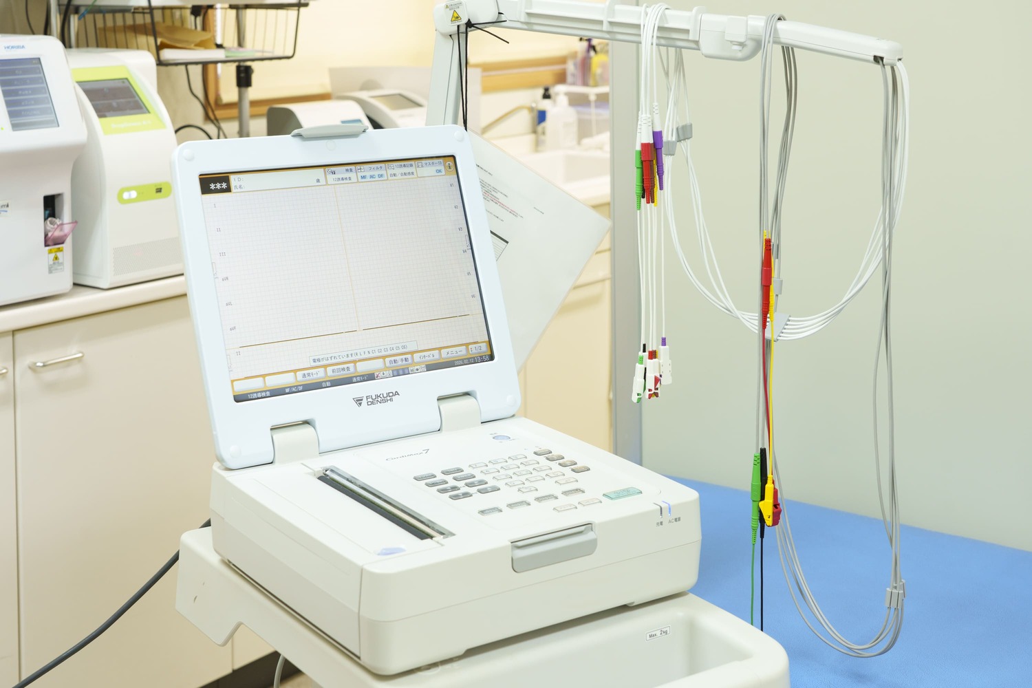 心電図とは、心臓の筋肉の収縮に伴って発生する微量の電流を波形としてグラフにあらわしたものです。心疾患などをさまざまな心臓の情報が得られます。